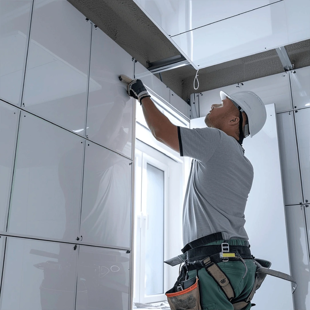 تصميم وتنفيذ الديكورات الداخلية، الأرضيات، والأسقف.